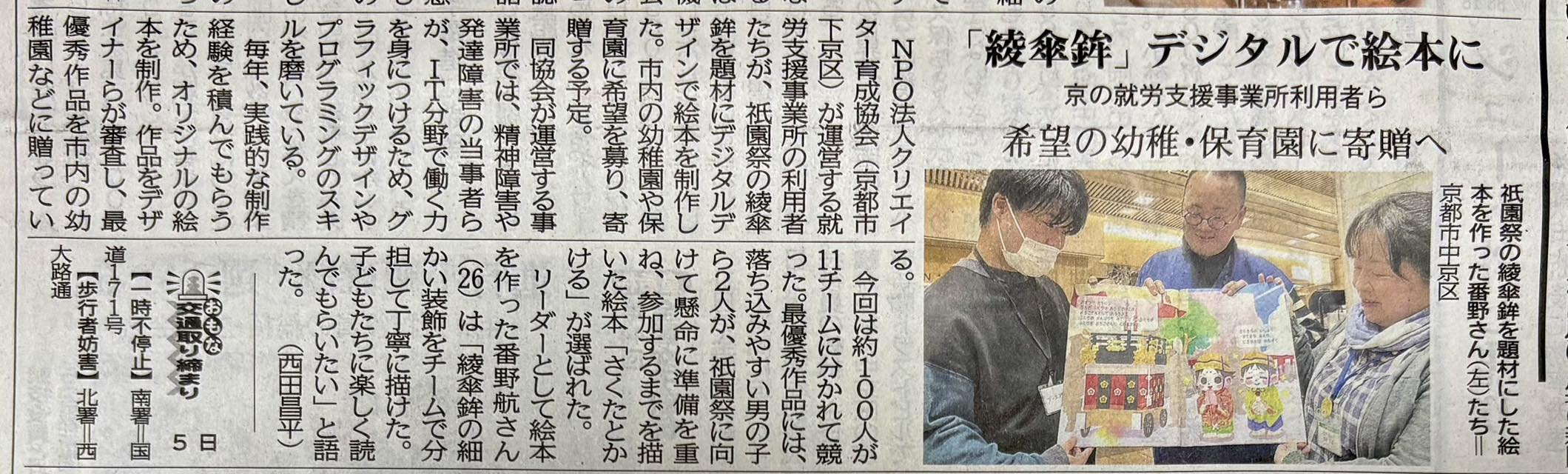 2026年1月5日付の京都新聞にて、昨年11月に開催した展示会で紹介した絵本制作プロジェクトの様子をご紹介いただきました!
